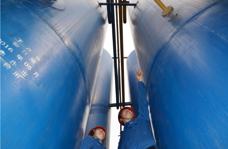 图为动力一分厂职工正在检查仪表风罐及管道