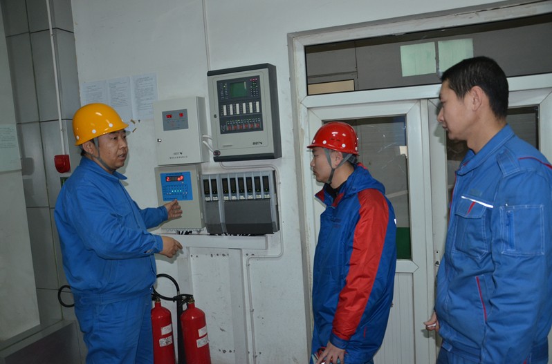 图为安环质量处处长助理郭立新(右)在为岗位职工讲解系统原理