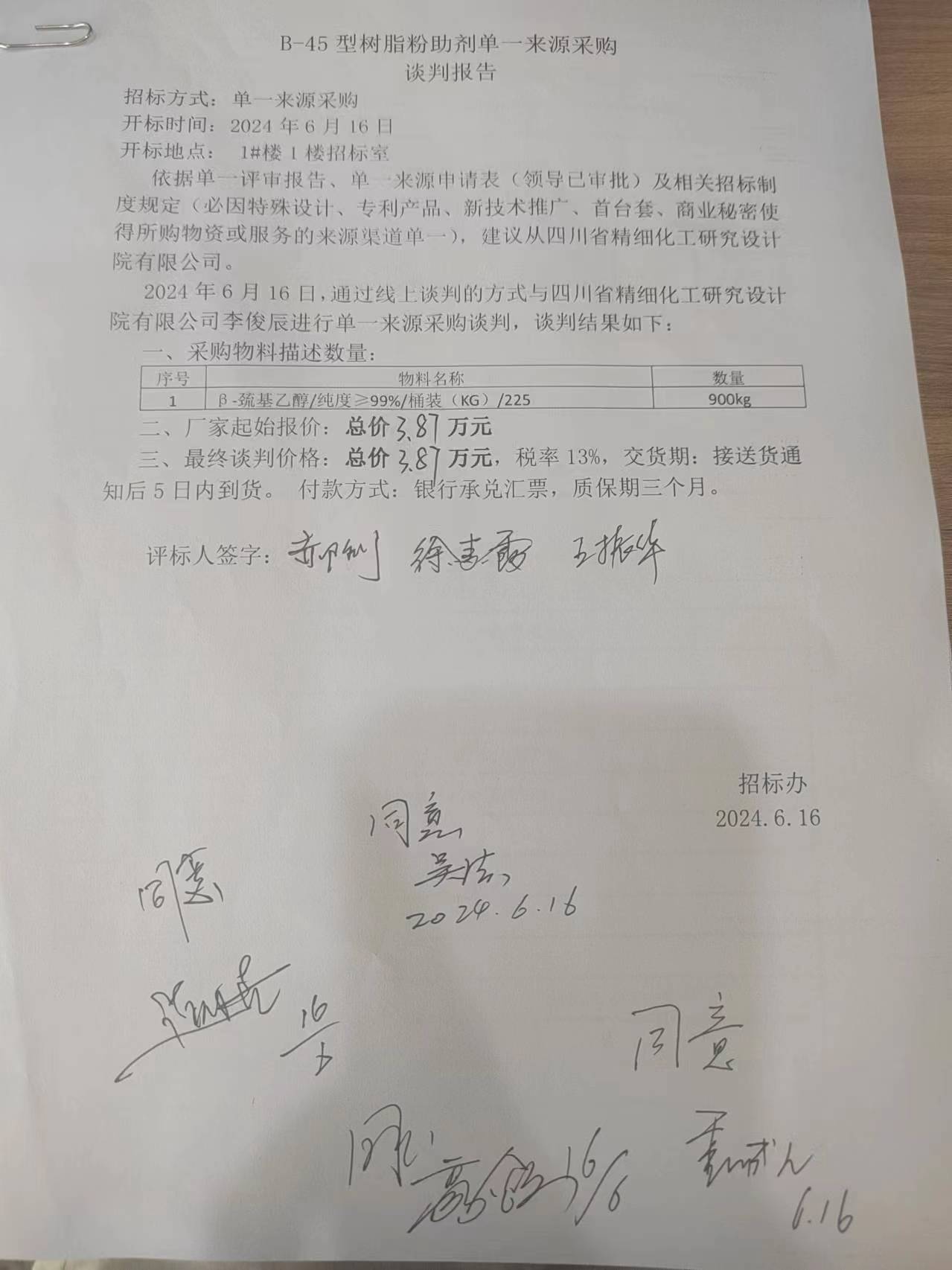1. 项目名称:试生产600吨B-45型树脂粉助剂采购