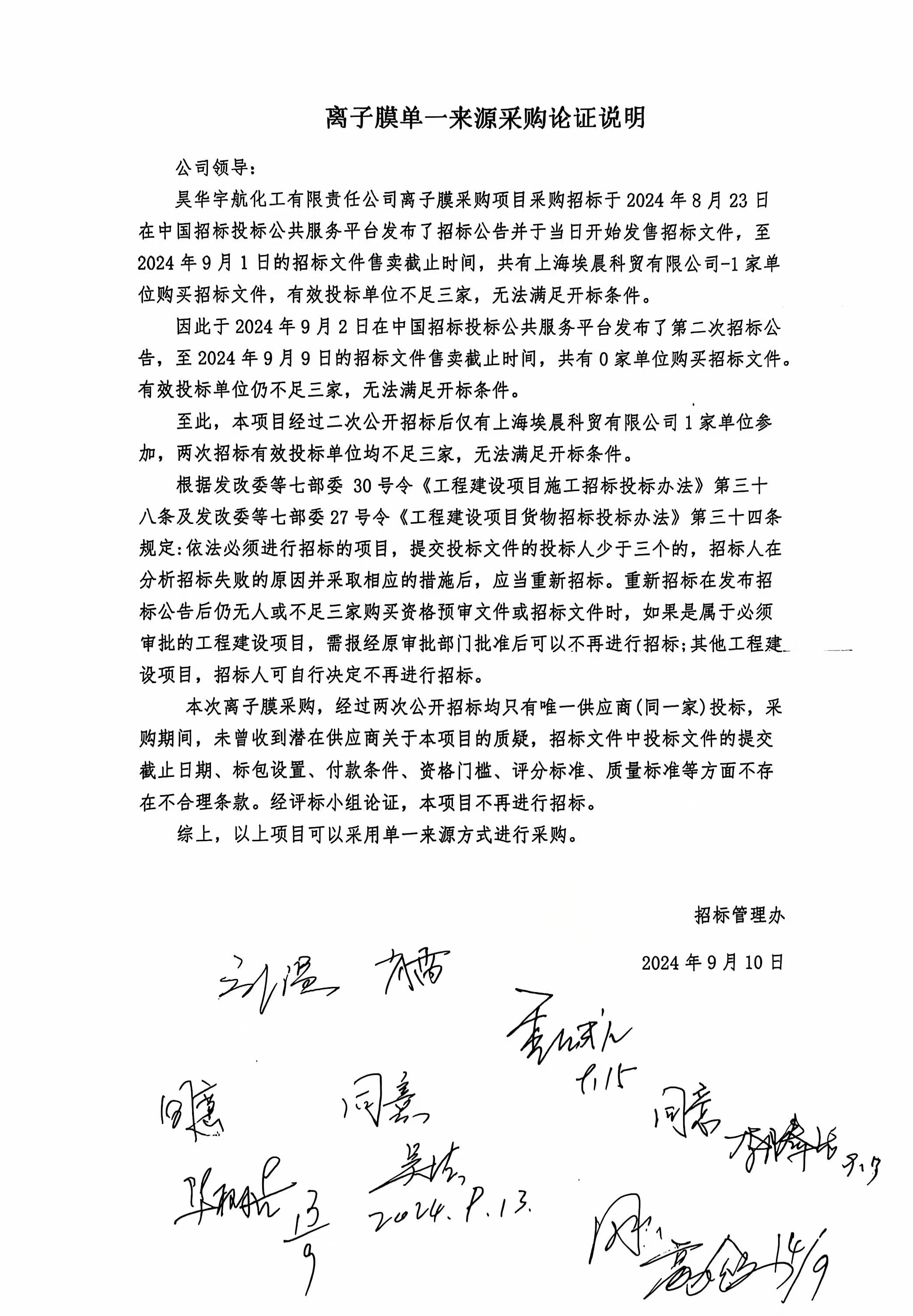 本次离子膜采购,经过两次公开招标均只有唯一供应商(同一家)投标,采购期间,未曾收到潜在供应商关于本项目的质疑,招标文件中投标文件的提交截止日期、标包设置、付款条件、资格门槛、评分标准、质量标准等方面不存在不合理条款。经评标小组论证,本项目不再进行招标。